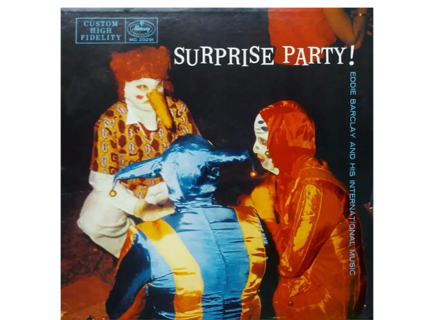 “Surprise Party!” by Eddie Barclay and His International Music, released on the Mercury label. The cover shows people in clown/masquerade costumes, which fits the playful, slightly surreal party theme common in late 1950s and early 1960s lounge and orchestral pop albums.